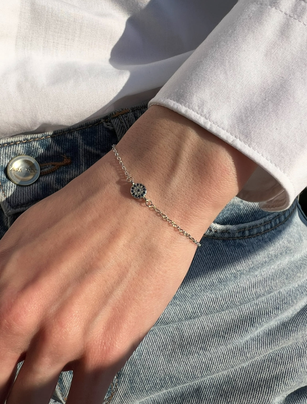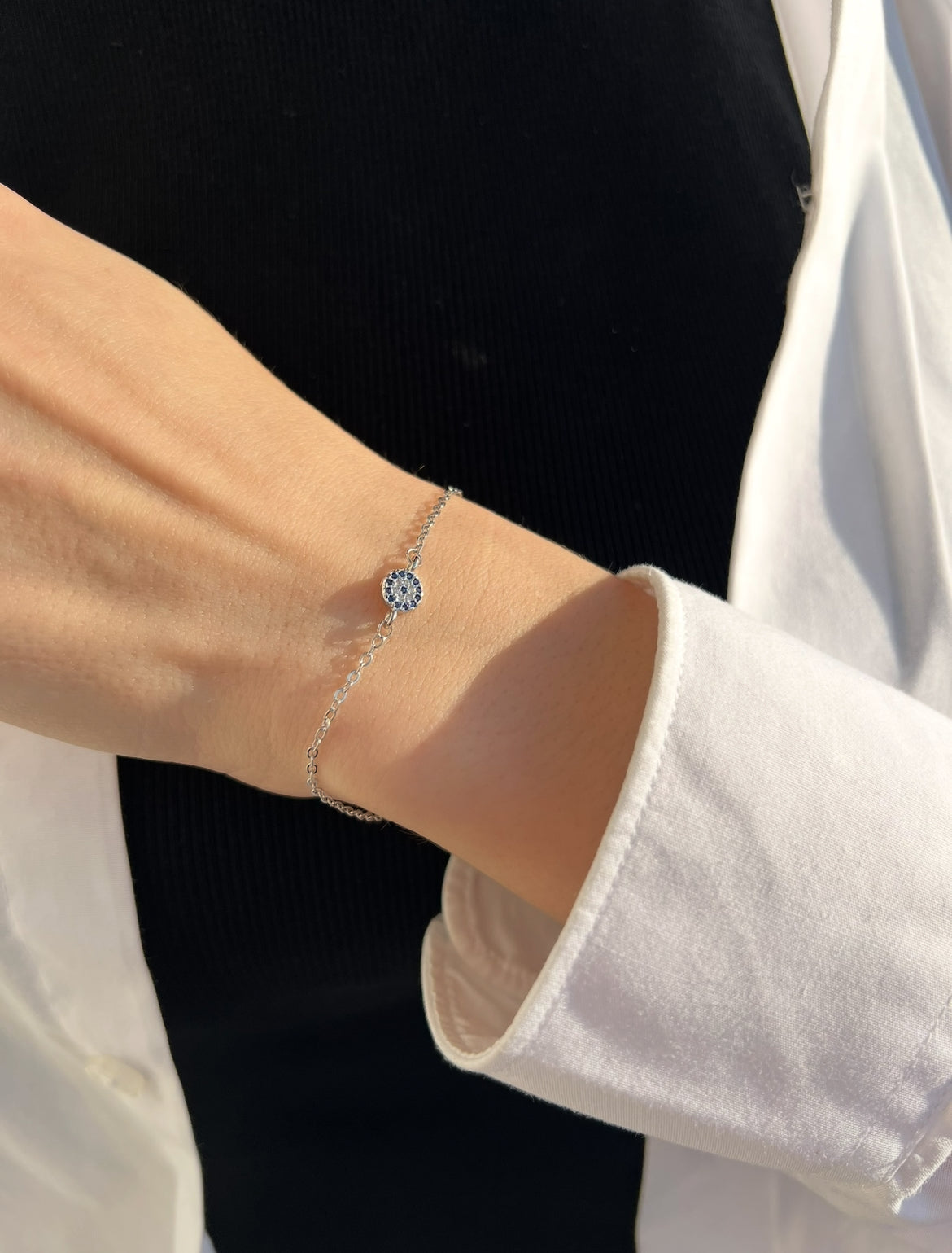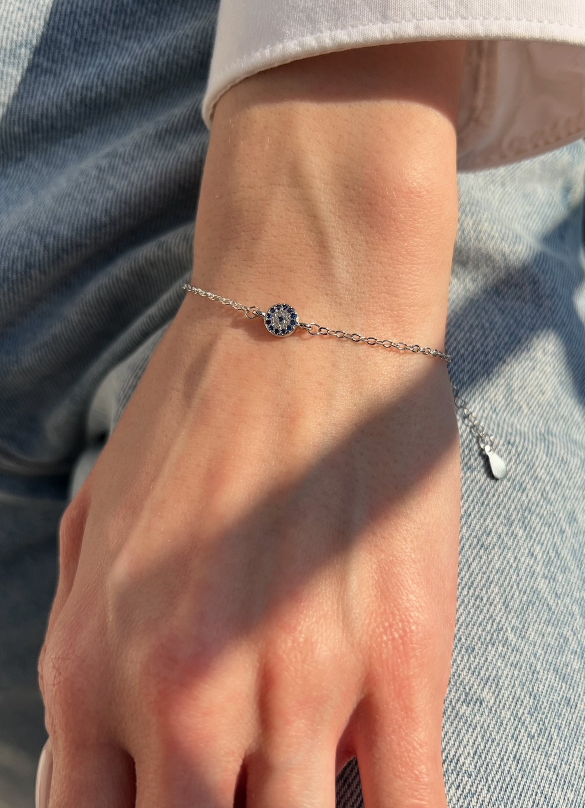 Цей вишуканий браслет із делікатним кулоном у формі кола, інкрустованим синіми та прозорими кристалами, втілює ніжність і стиль.