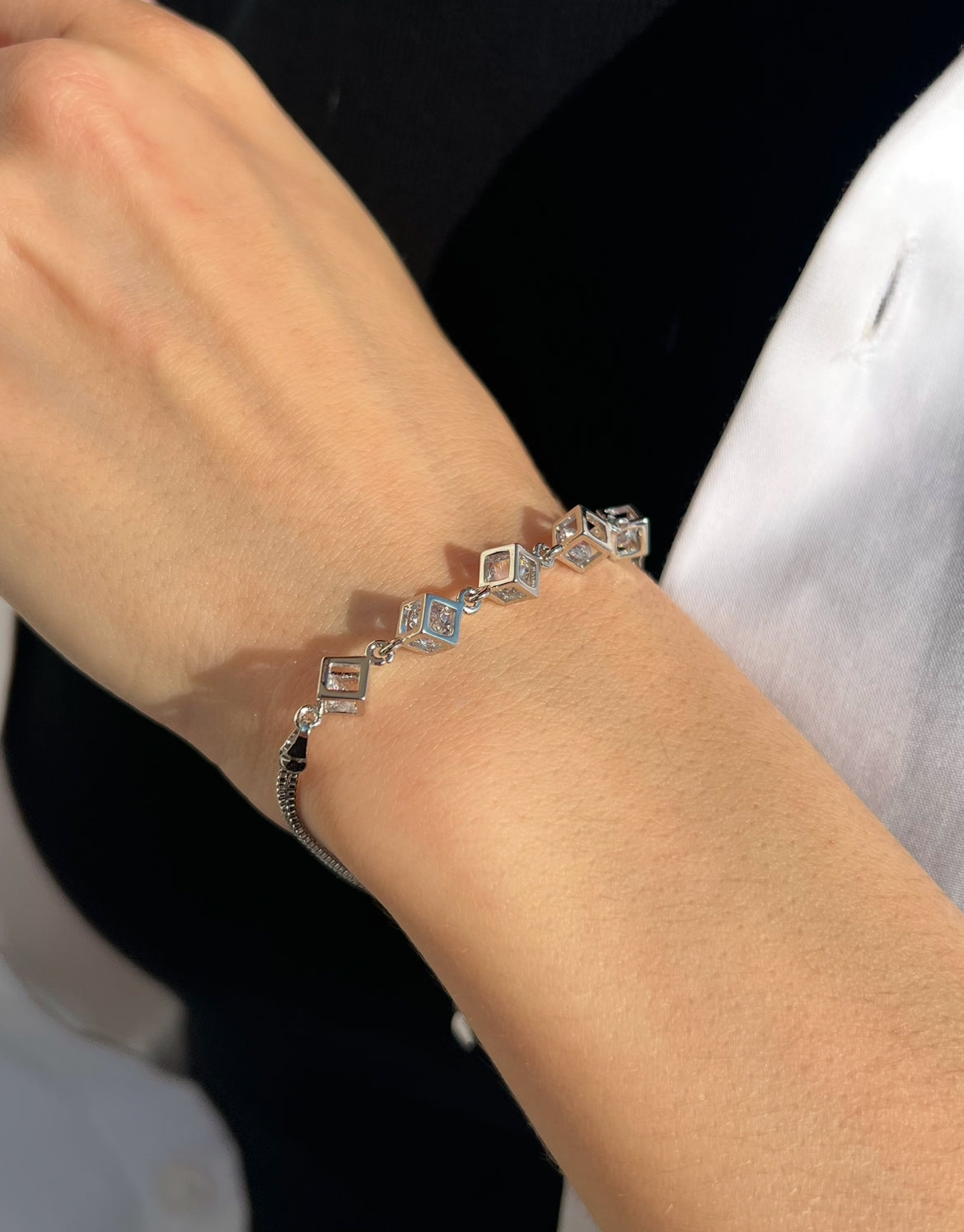 Цей стильний браслет із геометричними елементами у формі кубів та сяючими кристалами вражає своєю сучасною елегантністю. Витонченість дизайну доповнюється зручністю завдяки регульованій довжині ланцюжка. Ідеальний аксесуар для тих, хто цінує гармонійне поєднання геометрії та класики.