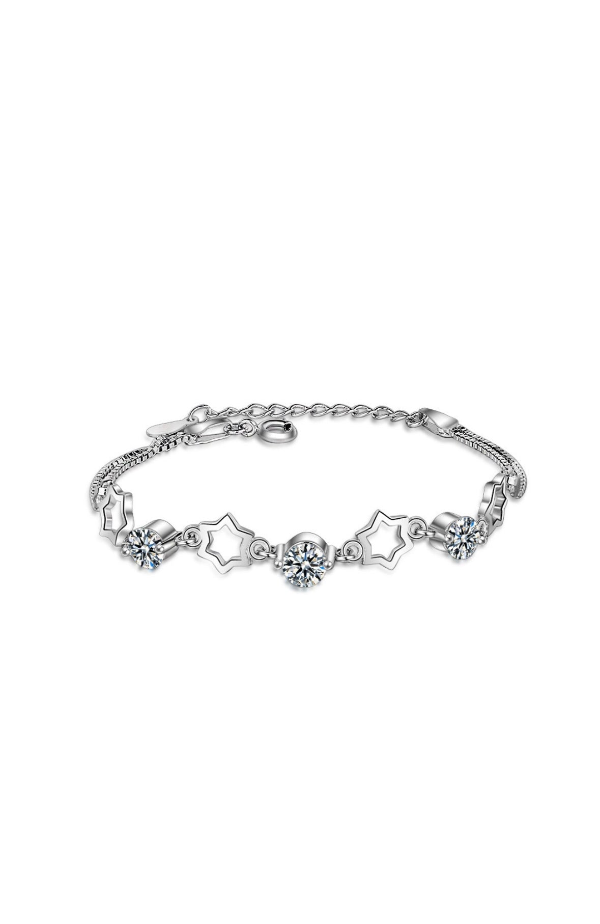 Браслет Nyxa захоплює витонченим поєднанням форм зірок і блискучих фіанітів. Легкий мотив нічного неба втілено у відкритих зірчастих елементах, що чергуються з каменями, що імітують зоряне сяйво.