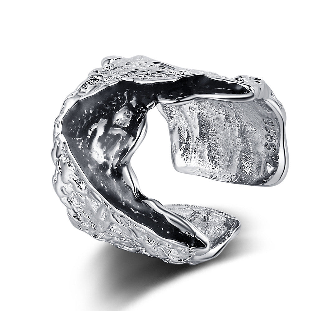 Ця унікальна каблучка вирізняється текстурованим дизайном, що нагадує поверхню місячного кратера. Виготовлена зі сріблястого металу, вона має неповторний і сучасний вигляд. Регульована конструкція дозволяє зручно носити каблучку на будь-якому пальці. Ідеальний вибір для тих, хто цінує незвичайний стиль та індивідуальність.