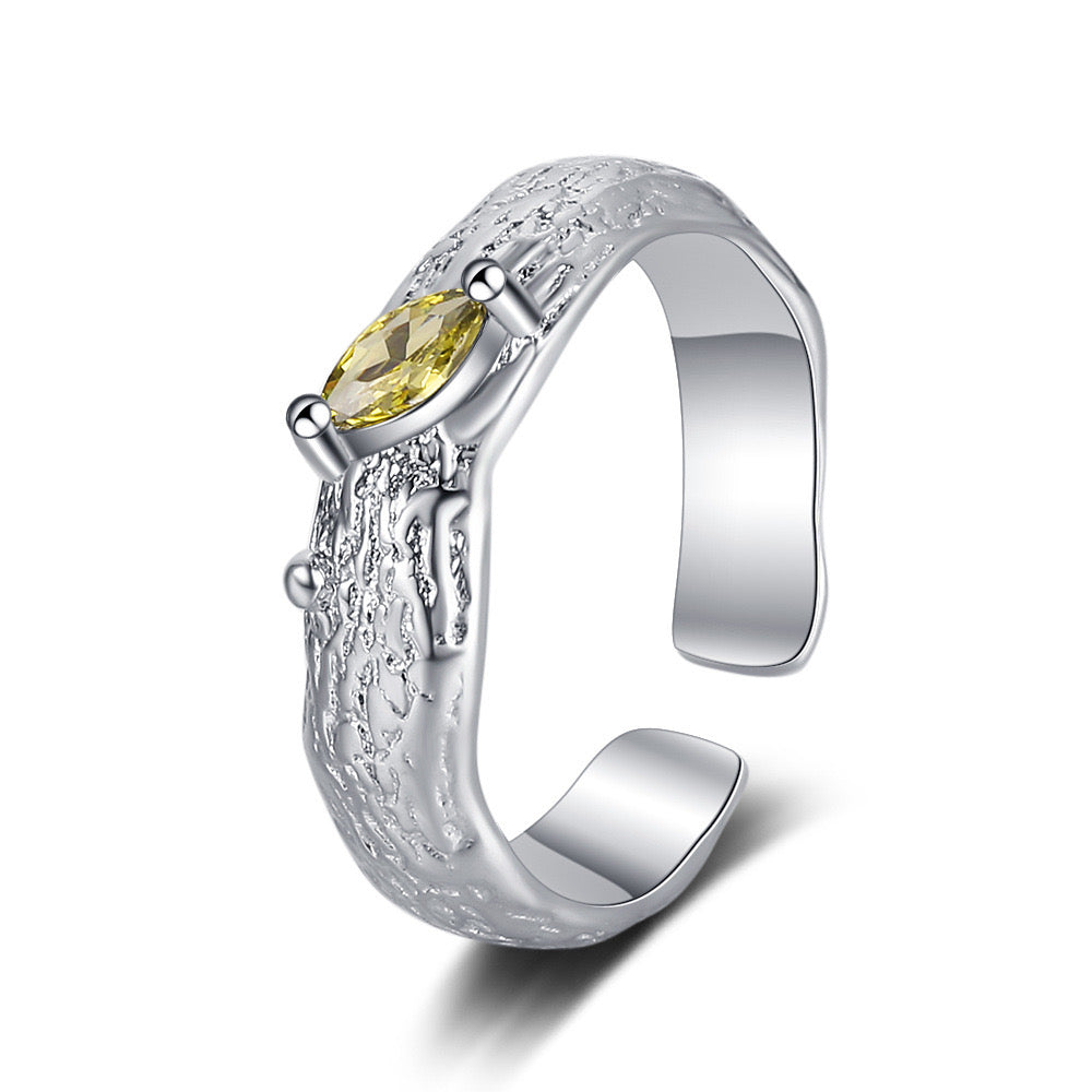 Каблучка Solara — це поєднання природної текстури й сяйва. Жовтий фіаніт у формі маркіза нагадує тепле сонце, яке пробивається крізь грубі фактури кори дерева. Експресивний дизайн для тих, хто хоче додати образу енергії й світла.