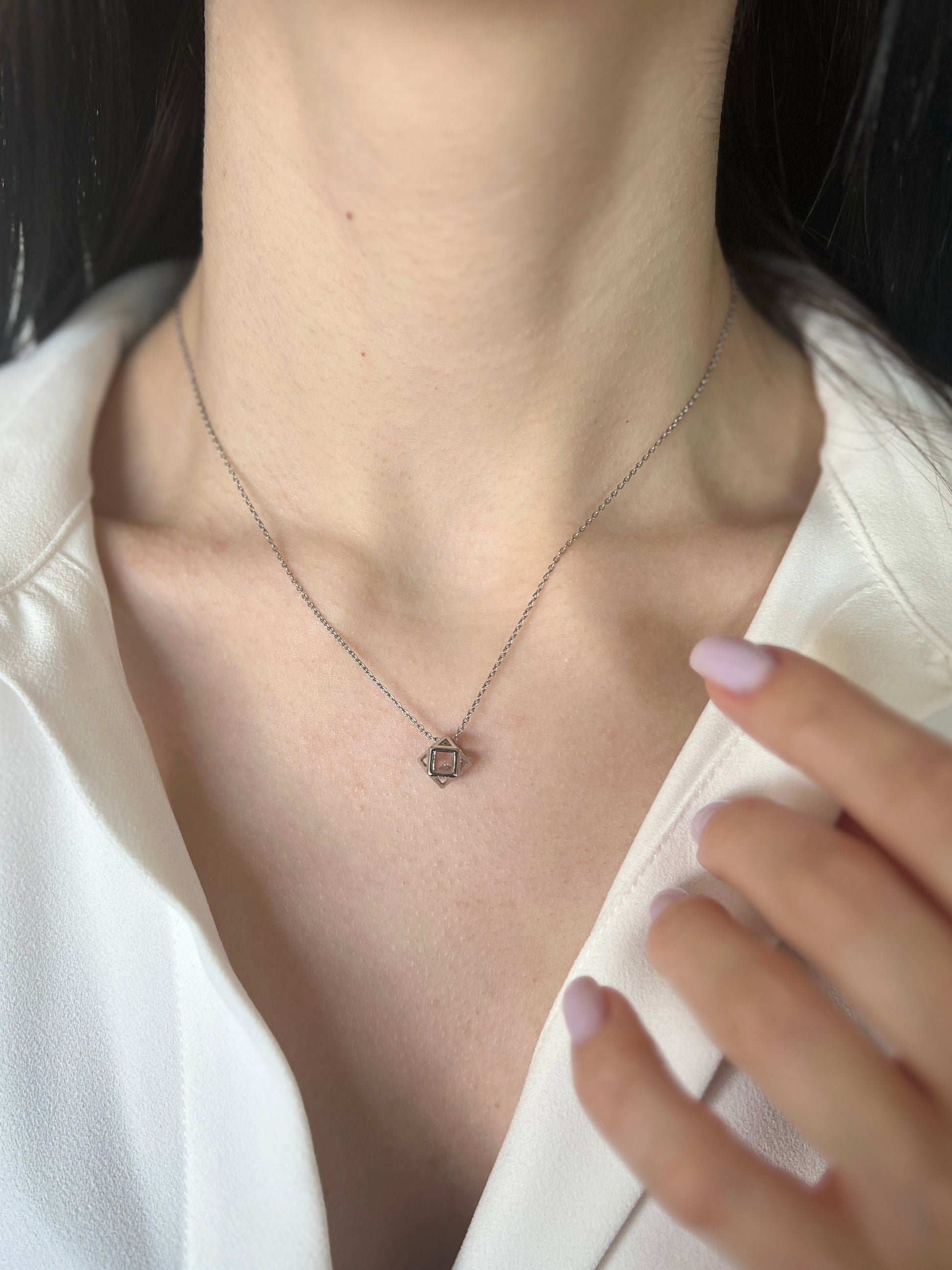 Центральний камінь, обрамлений чіткими лініями квадратів і трикутників, привертає увагу своєю досконалістю. Ця прикраса стане символом впевненості та гарного смаку, додаючи родзинку як діловому, так і вечірньому образу.