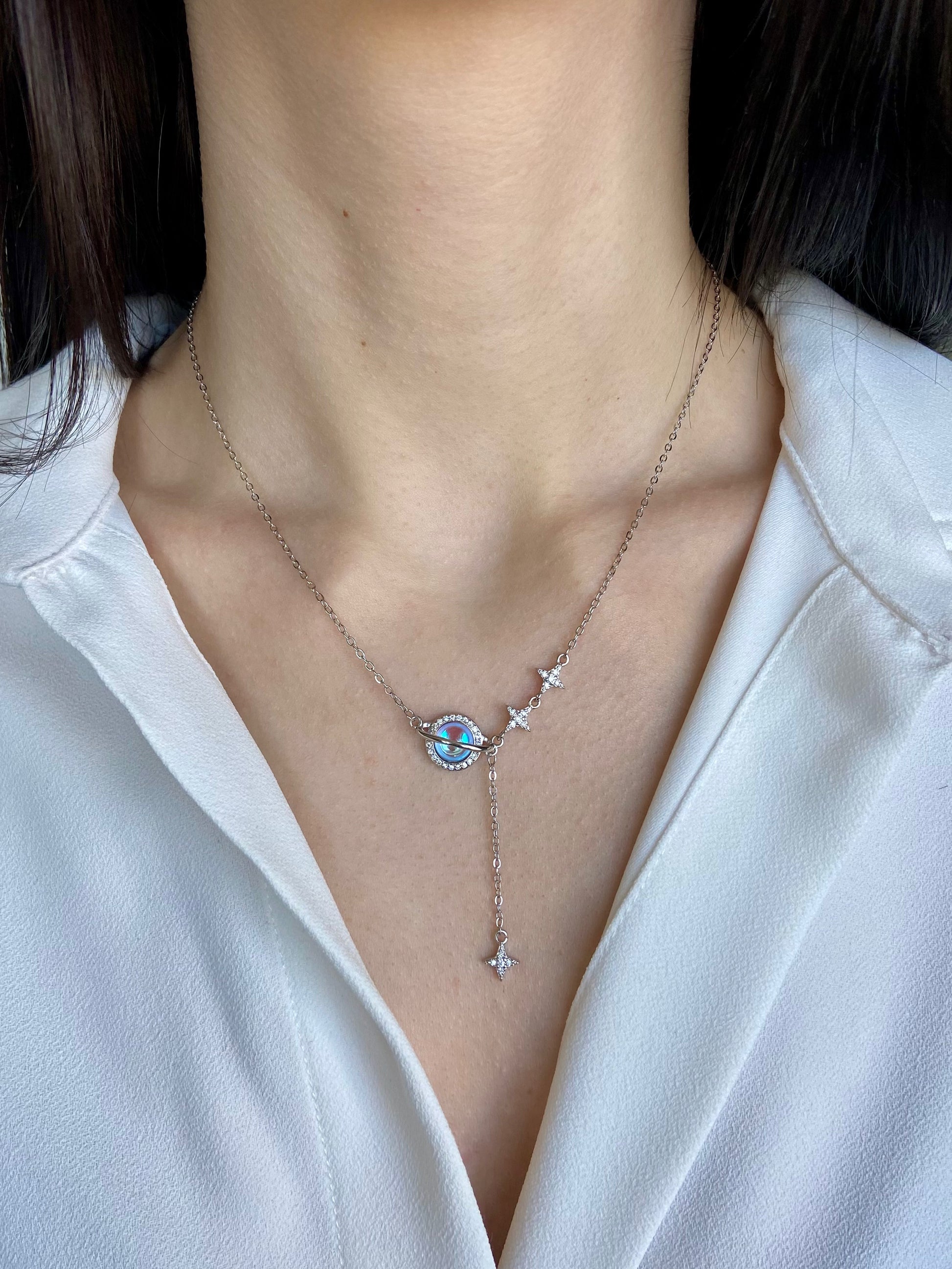 Підвіска Cosmic Glow — витончений аксесуар, натхненний красою зоряного неба. Дизайн із планетою, обрамленою кільцями та мерехтливими зірками, символізує гармонію космосу. Перламутрова вставка додає прикрасі глибини, створюючи магічний ефект. Ідеальний вибір для тих, хто мріє про незвідане.