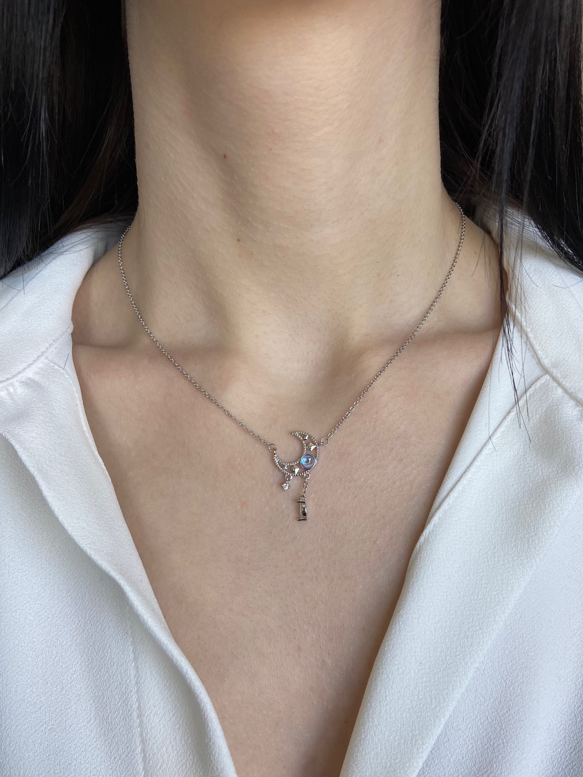 Підвіска Crescent -  у формі витонченого півмісяця, прикрашеного зірками та сяючими каменями, символізує гармонію ночі та світла. Ніжний блакитний акцент додає глибини й загадковості, створюючи відчуття небесної краси. Ідеальний вибір для тих, хто цінує унікальність і романтичний стиль.