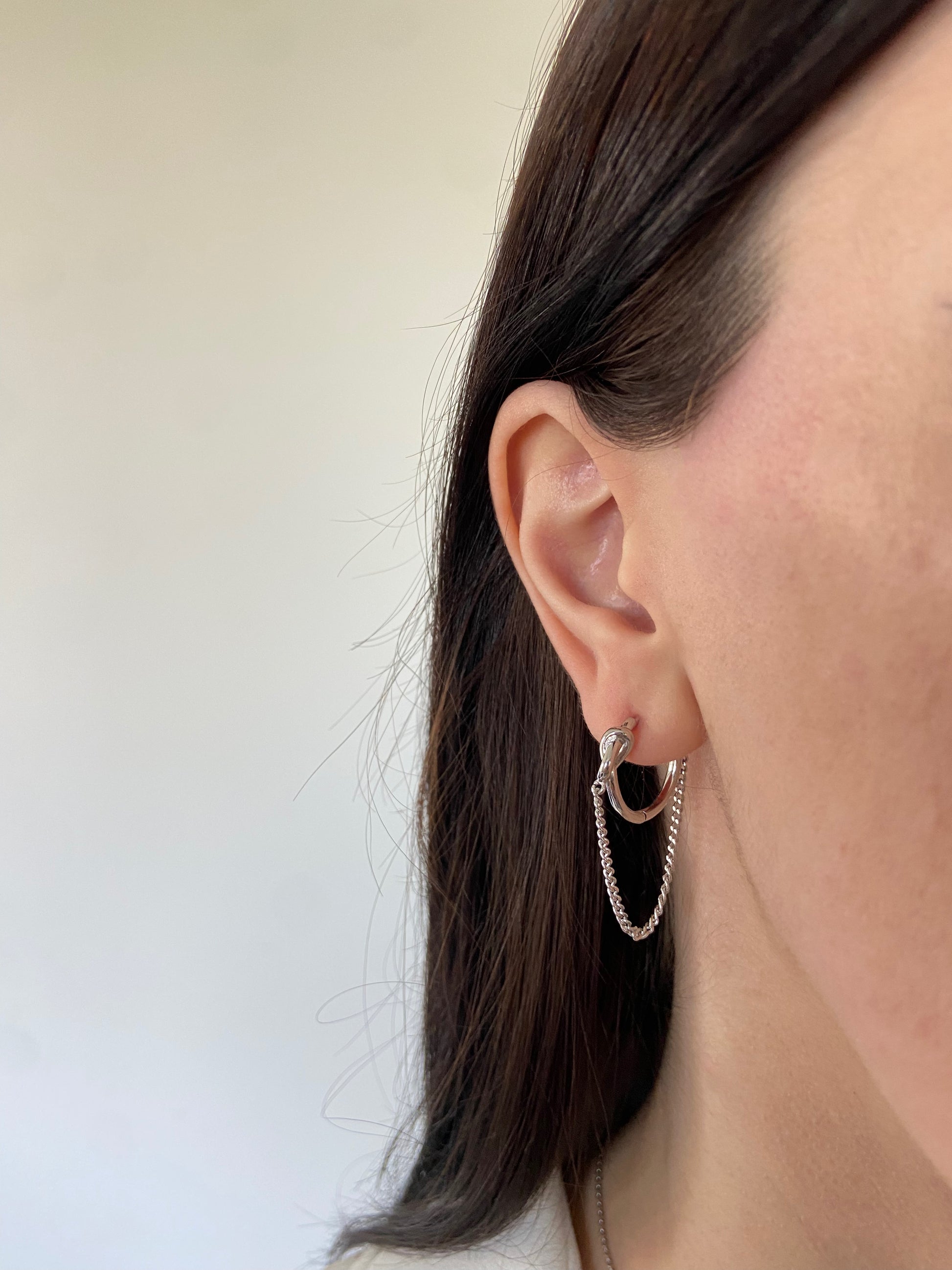 Сережки Chain Knot поєднують в собі мінімалістичний дизайн і сміливий акцент у вигляді тонкого ланцюжка, що додає їм унікальності. Стильне переплетення вузлів символізує міцність зв’язків і гармонію.